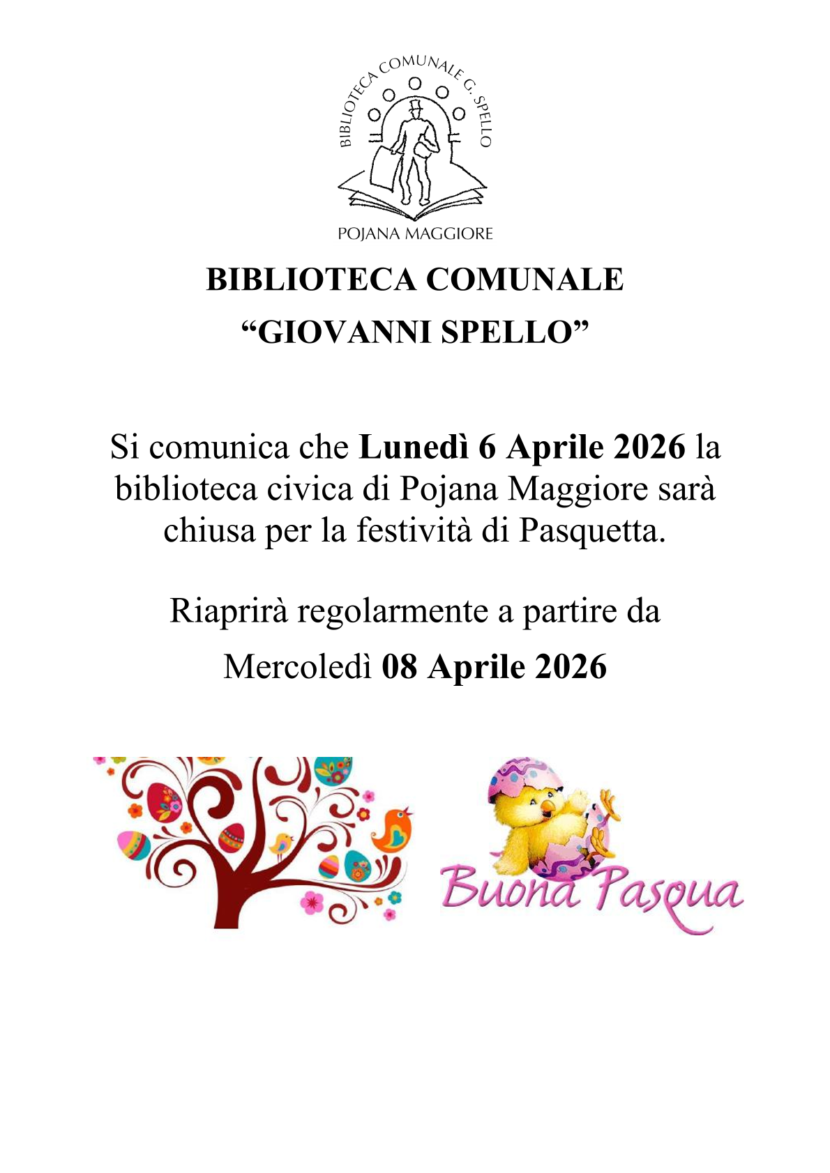 Si comunica che lunedì 6 aprile 2026 la Biblioteca Comunale "G. Spello" di Pojana Maggiore resterà chiusa in occasione della festività di Pasquetta.