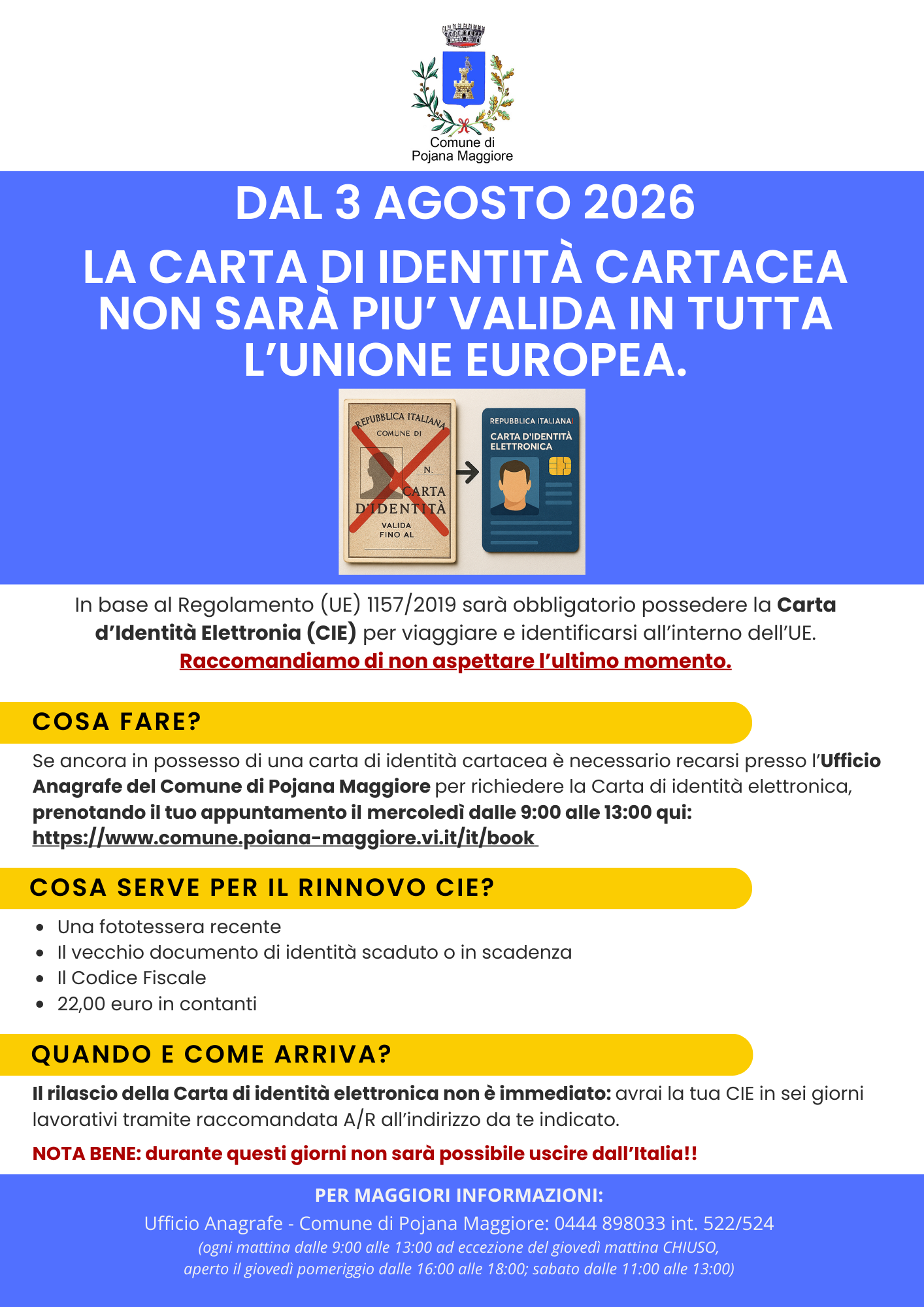 Si invitano pertanto i cittadini residenti nel territorio comunale ancora in possesso della carta d’identità cartacea a prenotare un appuntamento per il rilascio della carta di identità elettronica (CIE) a questo link: https://www.comune.poiana-maggiore.vi.it/it/book utilizzando le date e orari disponibili in Agenda (il mercoledì mattina dalle 9:00 alle 13:00)