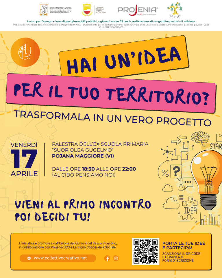 Collettivo Creativo è un progetto dell’Unione dei Comuni Basso Vicentino (Comune di Pojana Maggiore e Asigliano Veneto) con Projenia SCS e Cooperativa La Vigna, sviluppato nell’ambito dell’Avviso Pubblico Anci – II Edizione, dedicato alla presentazione di proposte progettuali per l’assegnazione di spazi/immobili pubblici a giovani under 35 per la realizzazione di progetti innovativi.