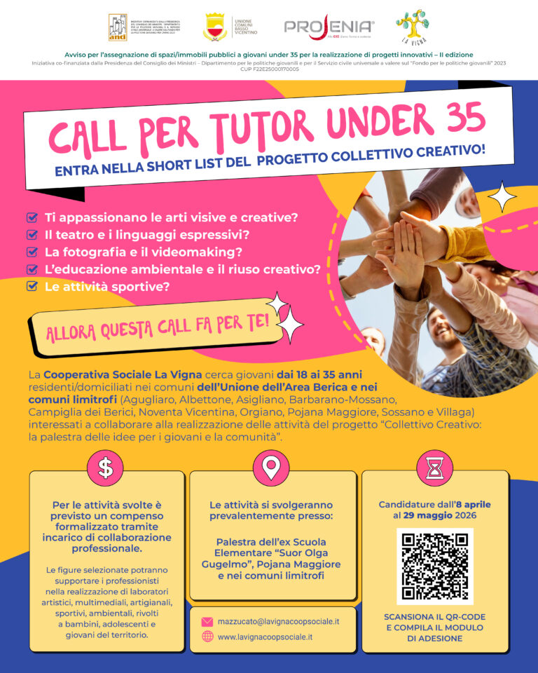 LA VIGNA SOCIETÀ COOPERATIVA SOCIALE, in qualità di soggetto attuatore del progetto "Collettivo Creativo: La Palestra delle Idee per i Giovani e la Comunità", seleziona esperti under 35 e/o associazioni giovanili per la costituzione di una short list finalizzata all'affidamento di incarichi di collaborazione occasionale.